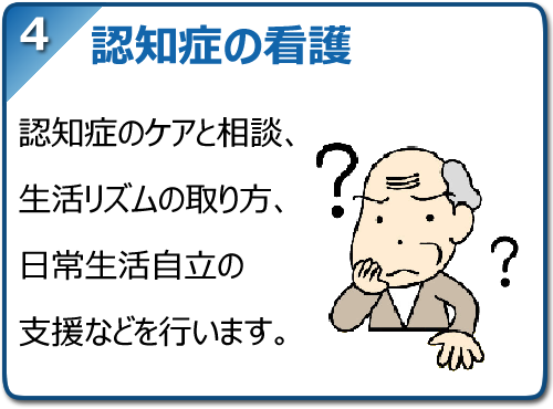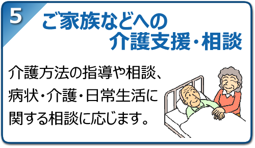 専門の看護師等が利用者様のご家庭を訪問し、病状や療養生活を看護の専門家の目で見守り、適切な判断に基づいたケアとアドバイスで在宅での療養生活が送れるように支援します。また主治医や関係機関と連携をとり、様々な在宅ケアサービスの使い方を提案します。
