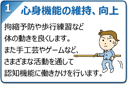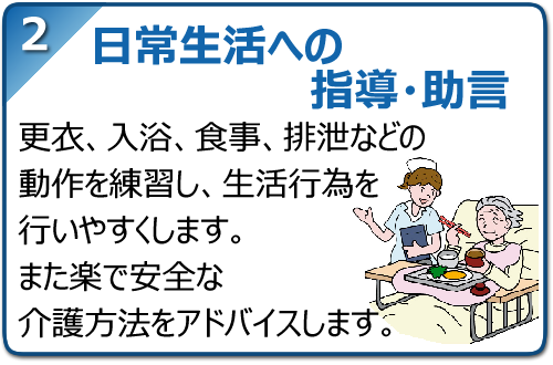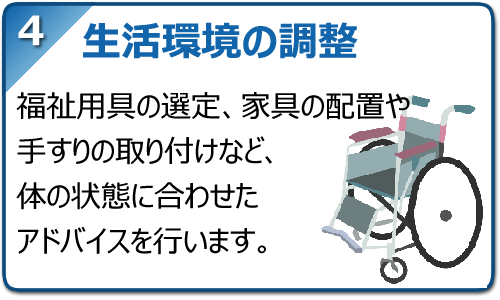 理学療法士と、作業療法士が、看護師と連携をとりながら、皆様の在宅生活をサポートします。ご本人やご家族の要望、ケアプランの目標に沿いながら、ゴールを設定し、身体や知的機能に働きかける運動や活動、住宅改修や福祉用具・補装具の相談、自主訓練の指導などを行います。