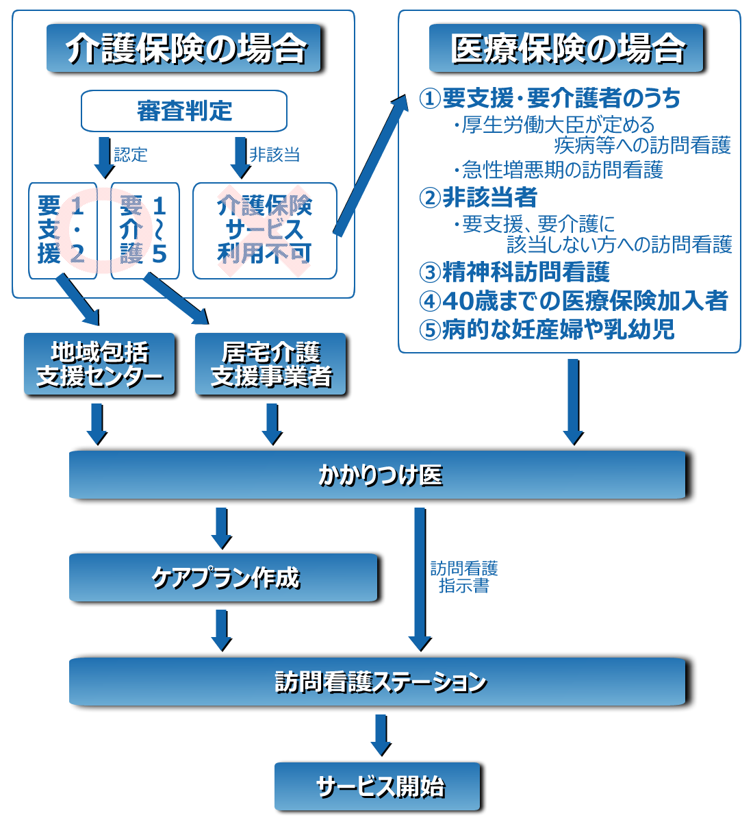 介護保険で訪問看護のご利用を希望する際には、予め介護保険の申請手続きを行い、認定を受ける必要があります。要支援認定を受けた場合は地域包括支援センターへ、要介護認定を受けた場合は居宅介護支援事業者へご相談下さい。